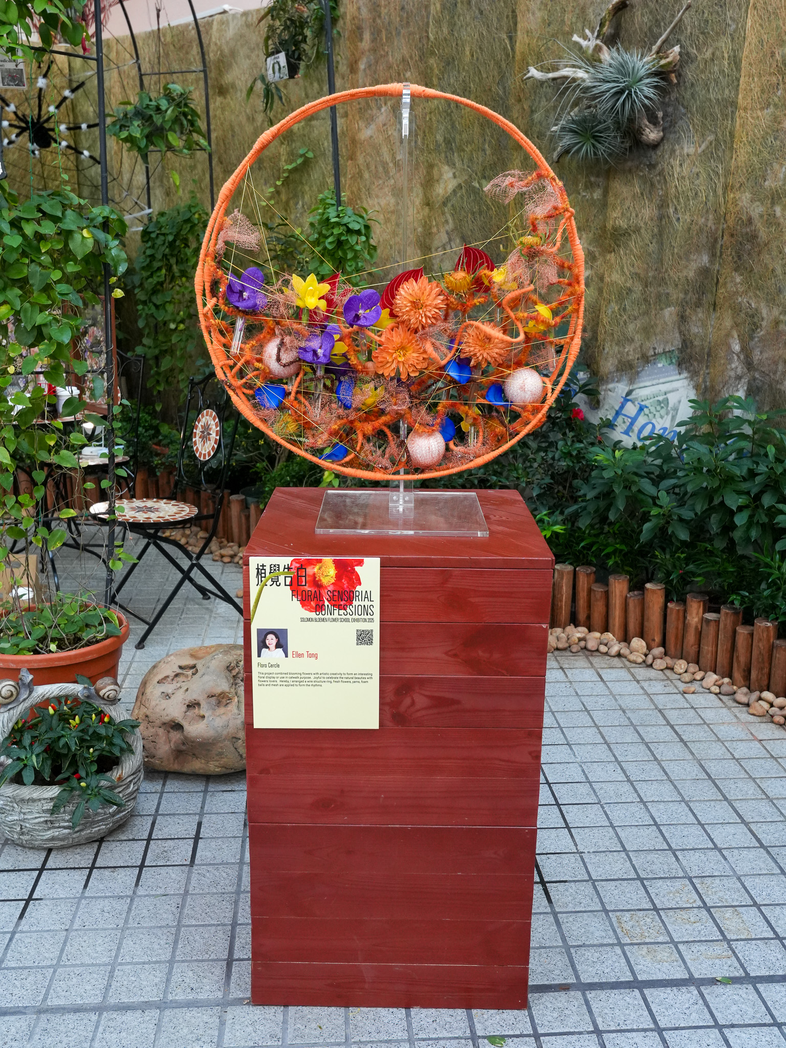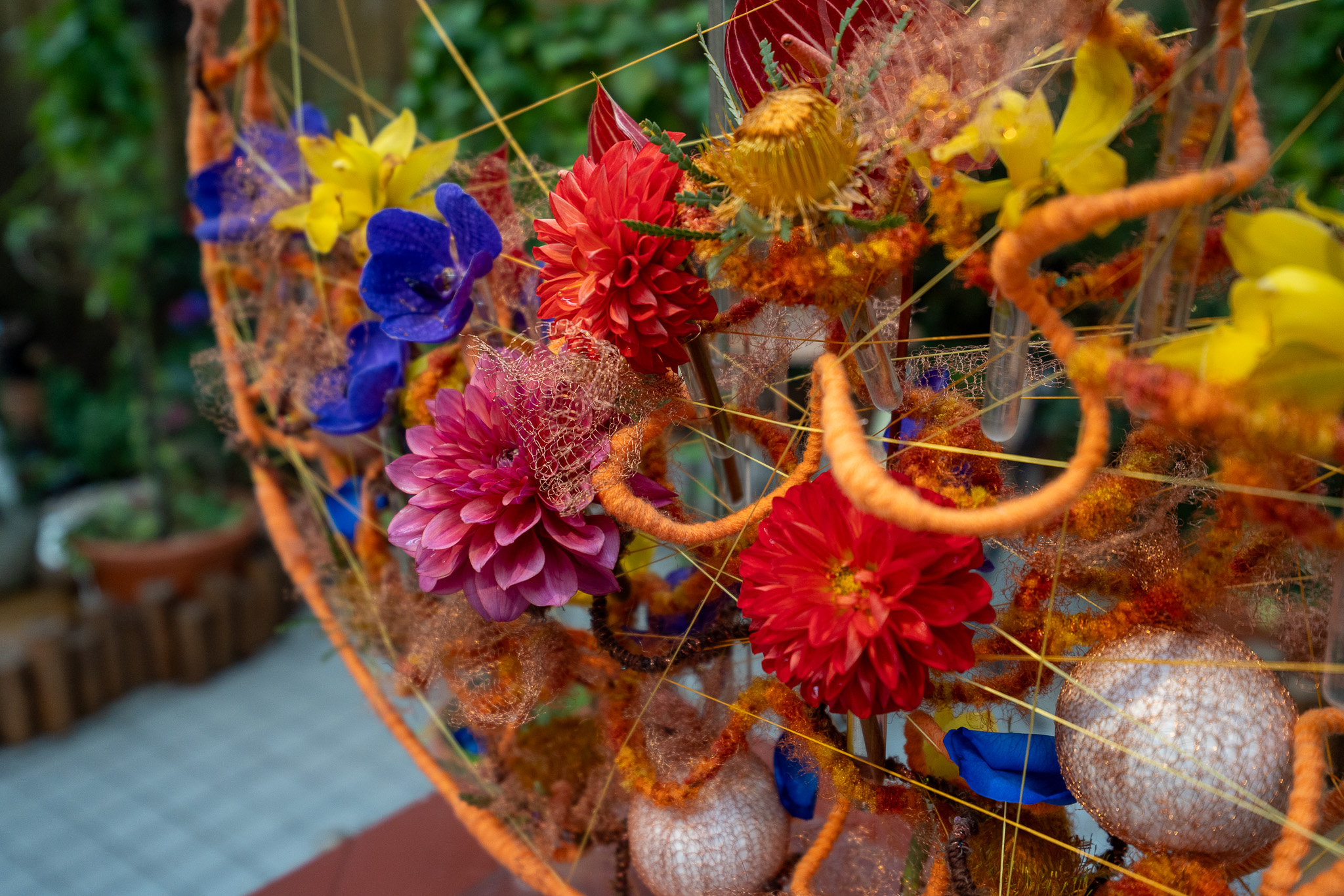 This project combined blooming flowers with artistic creativity to form an interesting floral display or use in catwalk purpose. Joyful to celebrate the natural beauties with flowers lovers. Hereby, I arranged a wire structure ring, fresh flowers, yarns, foam balls and mesh are applied to form the rhythms.