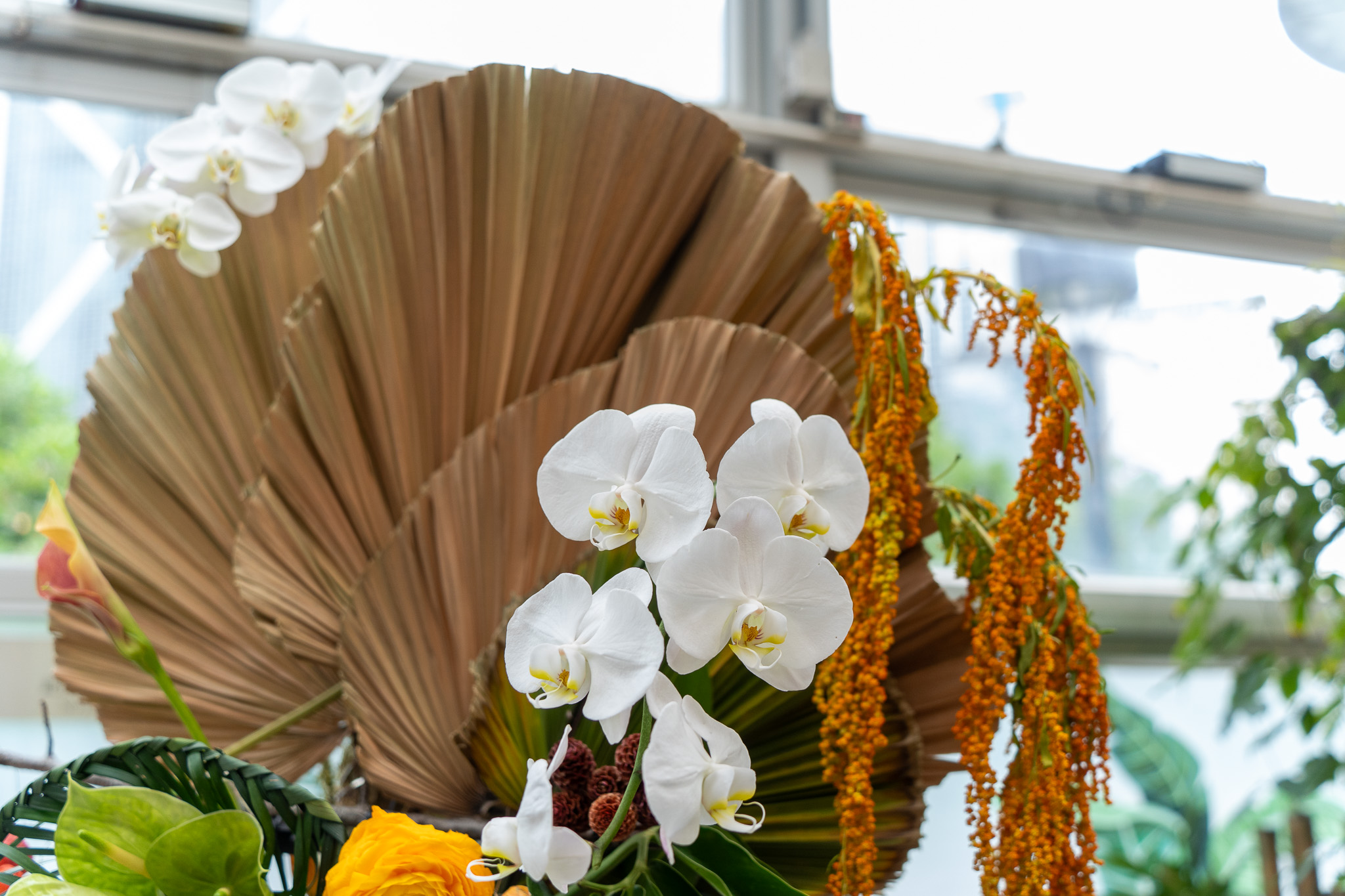 This design features sunflowers and sunflower discs as the main flowers. Other floral elements include lucky bamboo, cordyline leaves, phalaenopsis orchids, eucalyptus berries, and physalis. Binding and weaving techniques are used in the design.
