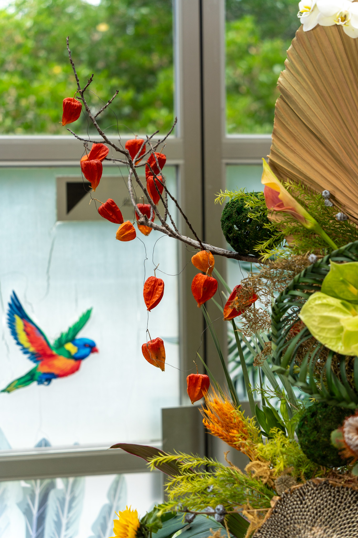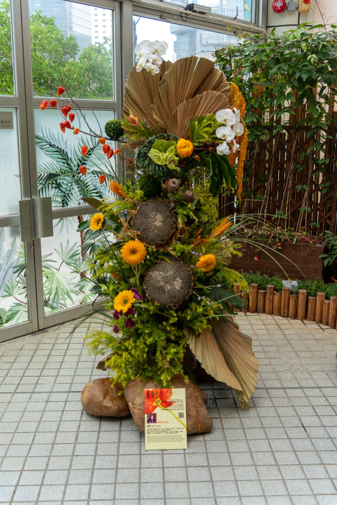 茂盛的樹木及漂亮的花卉,往往可以帶給大家正能量。她們有着不同的 形態、香氣及花語,更可以代表大家表達情感。 這個設計用了向日葵及向日葵花盤為主花,其他花材包括彎竹、鐵葉、蝴蝶蘭、尤加利果及酸醬果...等,以捆綁及編織的技巧製作。