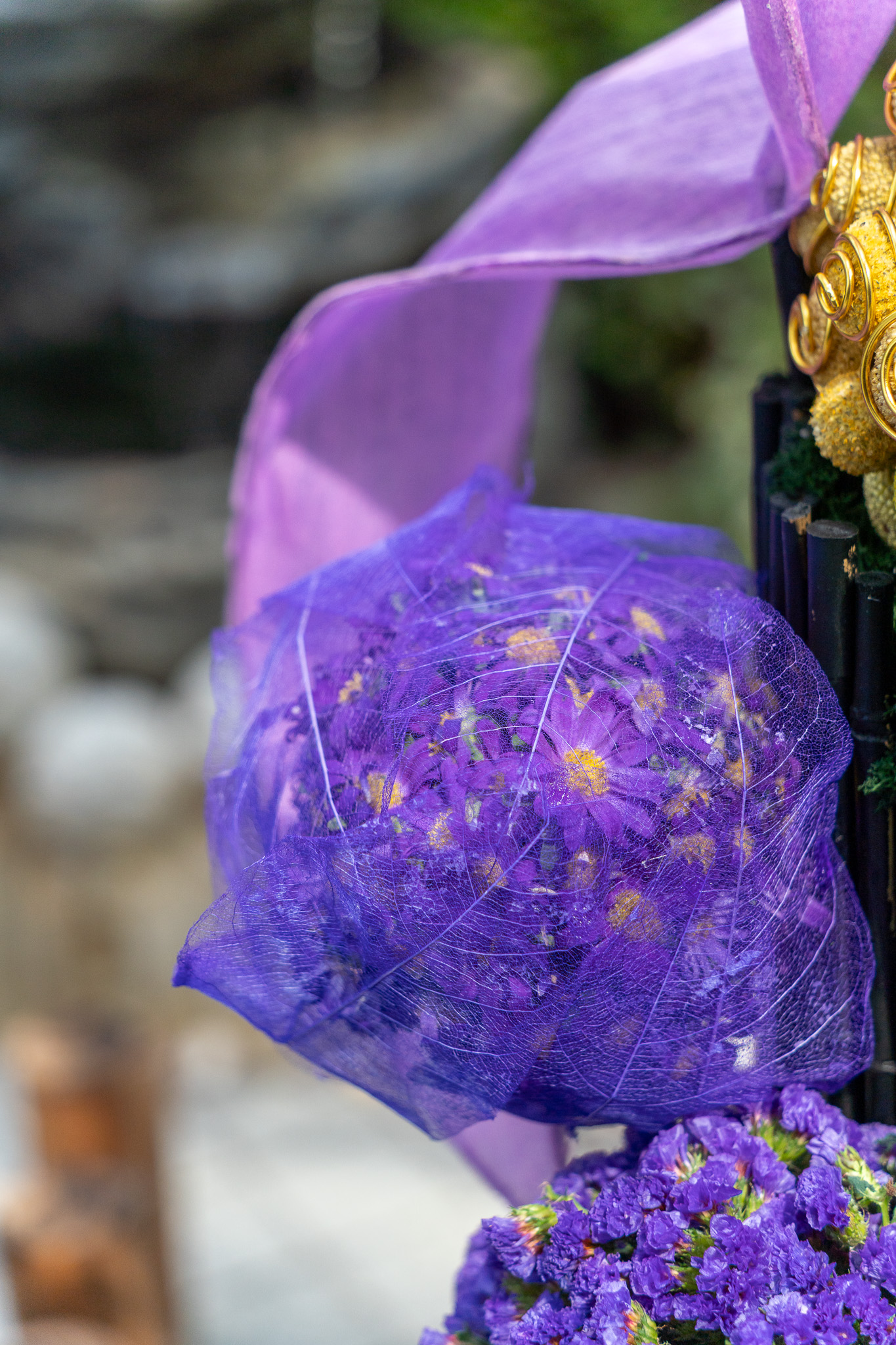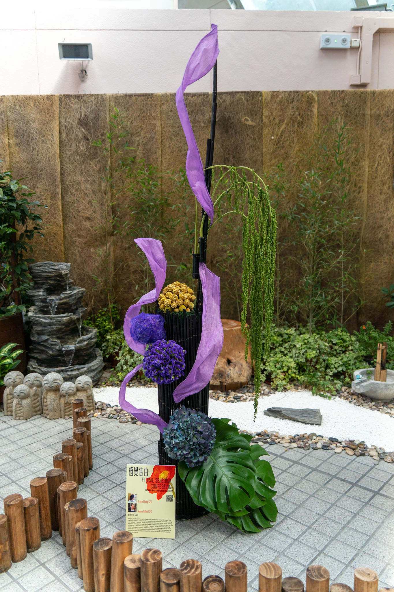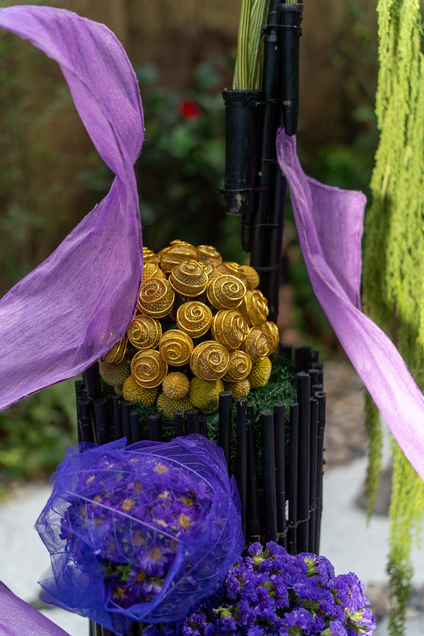 Stepping into Alice in Wonderland, everything is dreamlike and full of novelty. This tree-like sculpture is constructed from black bamboo poles, with Amaranthus, being used to create a romantic, garden-inspired design! Characterized by its long, trailing stems and clusters of tiny, bead-like flowers, it adds movement and drama to the floral composition. The trunk is adorned with a variety of purple flower balls, including asters, hydrangeas, Limonium, and daisies. Their lovely shapes and delicate petals contribute to the dreamy and enchanting atmosphere. Adding large leaves, such as Monstera or Fatsia, to be placed around the bottom of the tree to emphasize the garden composition.
